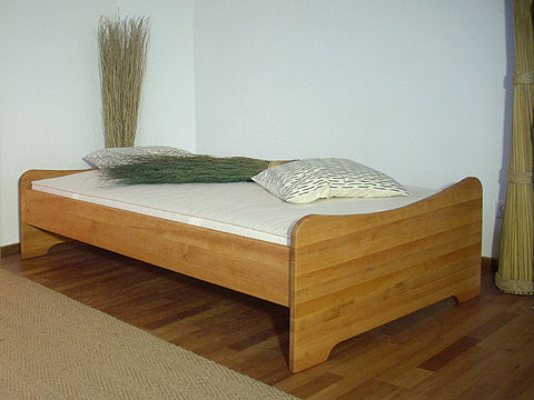 Das Einzelbett hat ein niedriges, leicht nach unten geschwungenes Kopf- und Fußteil. Die seitl. Rahmenhöhe beträgt 40cm. Das Bett ist aus europäischer Erle gefertigt, die fein geschliffenen Oberflächen sind mit Livos-Naturharzöl eingelassen.