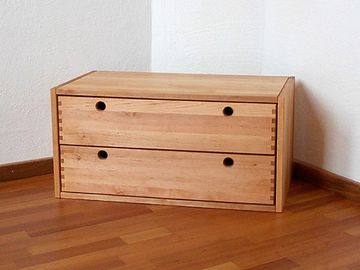 Eine Kommode mit zwei geräumigen, leicht laufenden Schubkästen für Spielsachen, Kleidung und vielen anderen Dingen.